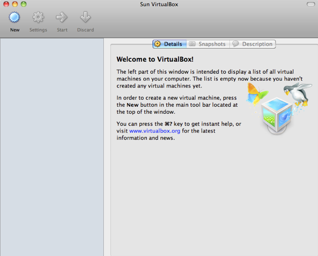Once that’s done, download a version of VirtualBox for whatever OS you’re running on here and install it. After registering (or declining to) you’ll be met with a screen like this. Click the button that says “New” in the upper left hand corner. We’re going to be making a new virtual machine.: