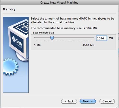 Choose how much memory to allocate to this virtual machine. This will be dependent on how much memory you have in your computer. The more, the better, but if you choose too much your real computer will become unstable/very slow.