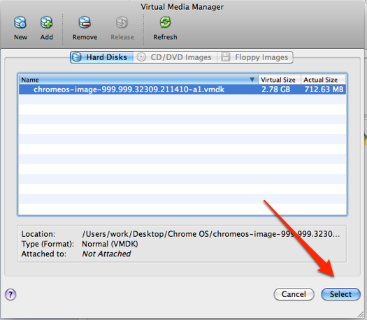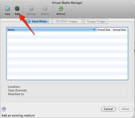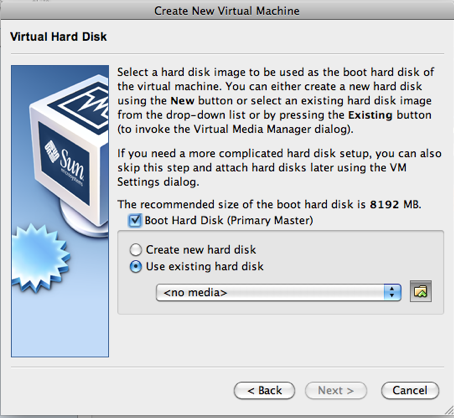 Here’s the tricky part (fortunately it isn’t very tricky). You don’t want to create a new hard disk, instead, you want to use an existing hard disk. Don’t choose one from the drop down menu either — you’re going to want to hit the folder icon just to the right of that to enter the ‘virtual media manager’.