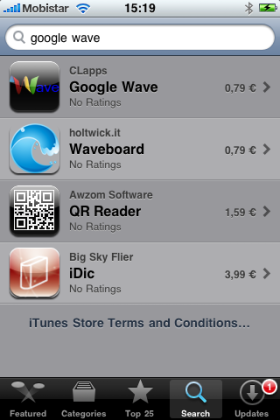 Do a search for Google Wave on the App Store from your iPhone or desktop client, and you’ll see an application called just that pop up, ready to be installed as soon as you fork over $0.99 (or €0.79 in my case).