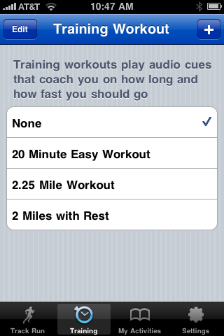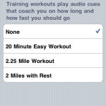 The app comes in two versions, Free and Pro [$9.99] and the Pro version includes voice prompts as well as photo and status updates from the road. The Pro version also allows you to set a special iPod playlist for your workout.