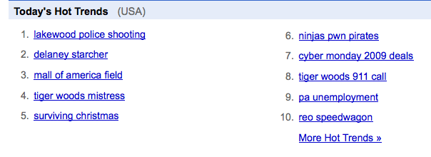 Whenever you want to take a reading of the current zeitgeist, popular search terms can tell you a lot about what’s on people’s minds. Right now, for instance, the hottest search terms on Google Trends include “lakewood police shooting,” “tiger woods mistress,” “surviving Christmas,” and “cyber monday 2009 deals.” If you look at Trending Topics on Twitter, however, you’ll see “#isitme,” “Google Wave,” and “Soul Train Awards.” I suspect only the last one might make it as a trending search term.