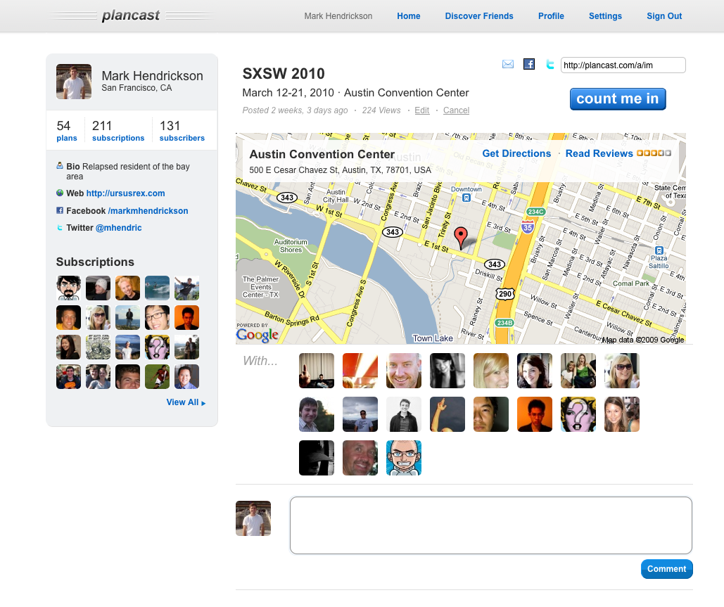 Likewise, Facebook and Evite allow you to make future plans, but both are still pretty formal and are based around the idea of the RSVP. With Plancast, you simply click on a friend’s event and if you want to tag along, you hit the “count me in” button, and you’re set. You can also comment on events, to get more information or share your thoughts on it.