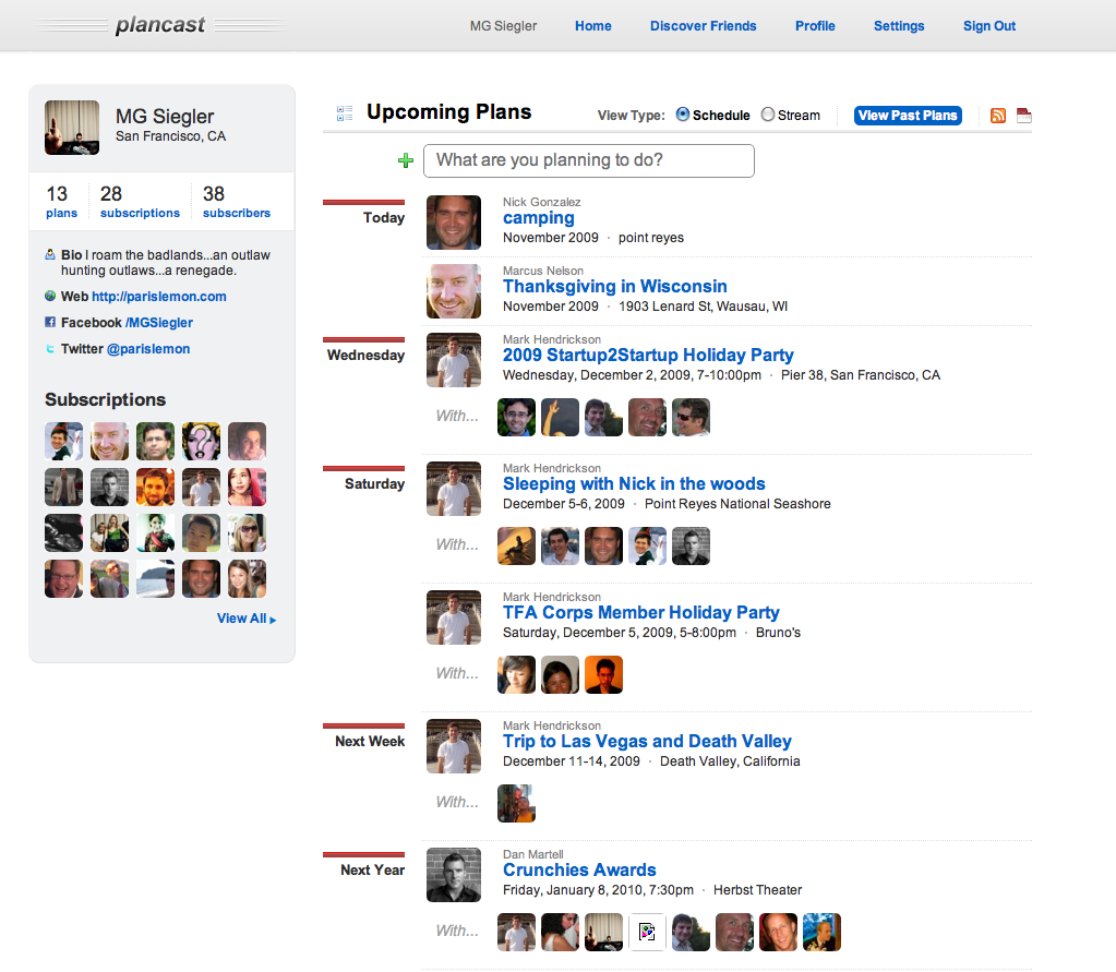 Here’s a perfect example: On my main Plancast page right now, I see that Hendrickson, another former TC writer Nick Gonzalez, and current TCer Jason Kincaid are all going to spend the night in the woods together in early December. I don’t know why they’re doing it, but they’re broadcasting that they’re doing it. That’s something that you really need to plan a little bit for, so if I wanted to join (I would if there was a hotel nearby that I could stay in), I could do so and let them know with the click of a button.