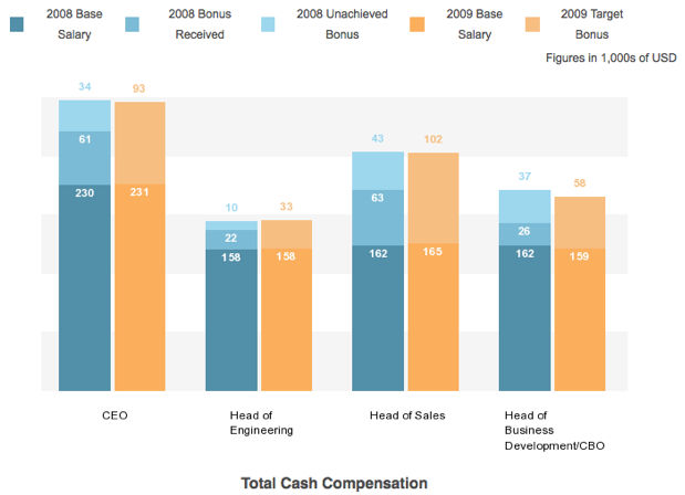 The average cash compensation for private tech CEOs in 2009 is on target to be $231,000, versus $230,000 last year. The average bonus for 2008 (which is also normally part of 2009 compensation) was an additional $61,000, and was down 6 percent from the prior year. These numbers are based on a survey of about 500 tech companies, most of which have fewer than 75 employees.