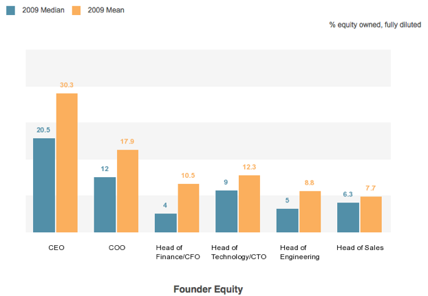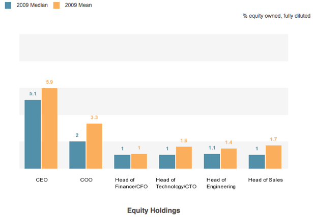 Below are some charts from the study, showing compensation across different titles for technology execs and equity compensation. Founder CEOs on average have 30 percent equity, while non-founder CEOs have 6 percent. Founder COOs have 18 percent, founder CTOs hold 12 percent, founder CFOs have 10.5 percent, founder heads of engineering have 8.8 percent, and founder head of sales have 7.7 percent. The corresponding equity positions for hires are between 1 and 3 percent.