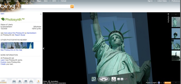 Bing Maps is also taking advantage of Microsoft’s very cool Photosynth technology, which we’ve covered extensively over the last few years. The technology can take multiple photos and stitch them together to create a 3D environment that you can “walk through” by clicking on each new photo. It’s a little bit like Street View, but these Synths are usually built around a landmark (like the Statue of Liberty) or even a museum. And let you see the subject from many different angles. Synths are represented on Bing Maps as green pins — click one, and you’ll get thrown into the synth.
