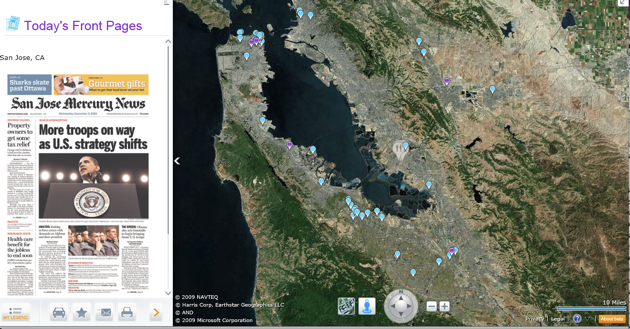 You can further customize your Maps experience by hitting the small arrow in the bottom left of the site’s UI. This will launch the “Map Apps” directory, which lets you overlay even more content on top of your map. For example, in the shot below I’ve enabled both the Twitter map and “Today’s Front Pages”. Geo-tagged tweets show up as blue pins, while clicking on a purple pin will show the front page of the local paper (you can see the San Jose Mercury news in the left sidebar). This obviously has a lot of potential, and Microsoft says it’s very open to allowing other third parties to integrating their own Map Apps.