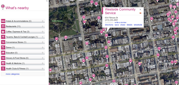 As you browse a map, you also have the option of checking out “What’s Nearby”, which plots hotels, restaurants, and other points of interest on the map. Again, Bing is doing some nifty things here. You’ll notice that if multiple POIs appear in the same place, Bing will intelligently combine them into a single icon with a (+) on it. Clicking that will then cause a full list of those locations to appear, each of which is easy to click on.