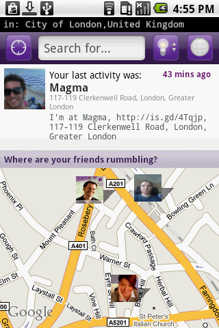 Social mobile location startup Rummble has gradually been updating its service over the last few weeks to meet the oncoming competition from new kids of the block like Foursquare. As we prefaced recently in the Summer, today it’s launched a new Android app for its service (download here). Rummble has had an iPhone app for a while and a Windows Mobile version is in the works.