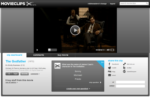And once you’ve found that clip you were looking for, like the infamous “I’ll be back” scene from the first Terminator movie, you can give it a thumbs up by ‘hyping’ or favoriting it, share your comments below the video or share the whole thing with your buddies on Facebook, Twitter, Digg and so on. It has trivia, too!