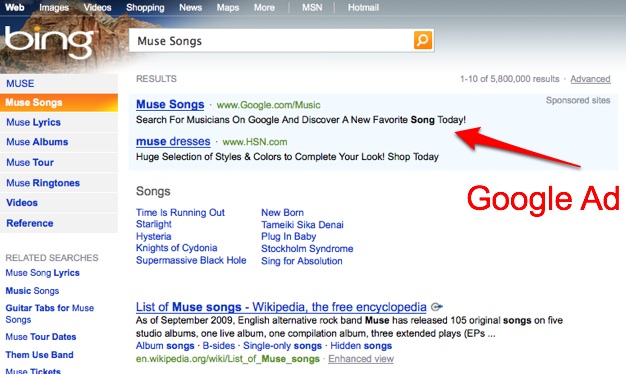 Sure, Google only launched its music search about a month ago and most people probably don’t even know it exists unless they search for a song or artist like “Muse” on Google, and even then they wouldn’t know there is a separate site because the playable song results appear right at the top of the regular search results. But try searching for “Muse songs” on some parts of Bing and you get a paid ad for Google Music search. The ads appear for other artists as well, such as Lady Gaga and Radiohead.