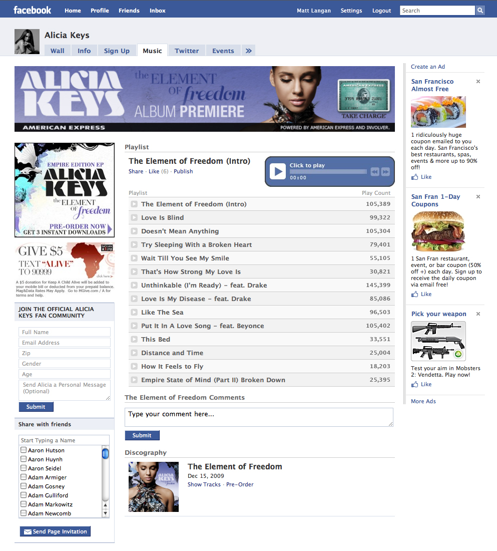 Alicia Keys fans will have another reason to compulsively check her Facebook fan page today: Keys is releasing her new album The Element of Freedom exclusively through the world’s largest social network. Fans will be able to tune in to her Facebook Fan page beginning today, where they’ll be able to stream the album free of charge (though they won’t be able to download digitial copies). The album’s “real” release date isn’t until December 15. This marks the first time a world-famous artist has debuted their album through the site. Keys is using a new Facebook app from Involver, a company that helps brands connect through social media, to power the launch.