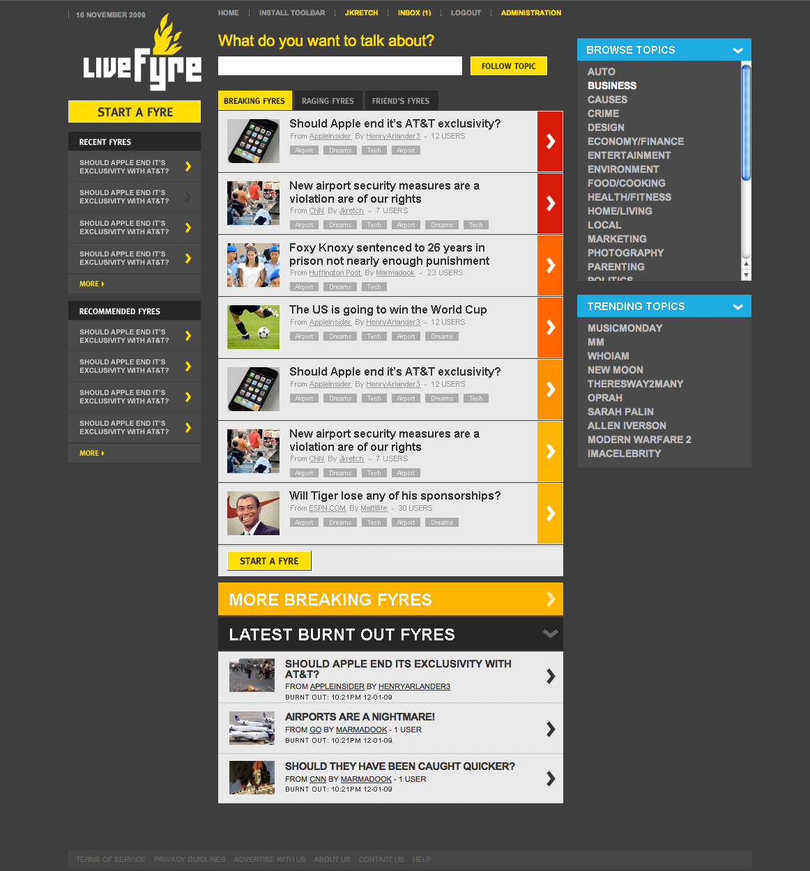 Taking a step back, the main area of LiveFyre is the key to discovering what to talk about on the site. The main screen consists of the latest “Breaking Fyres” at any given moment. These items, stacked on top of one another, show the headline, a thumbnail for a story, tags, and how many people are in the fyre talking about it.