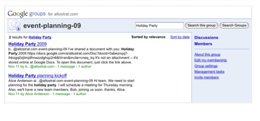 Google says that Groups is one of its most widely used applications. Groups is a collaborative application that essentially lets anyone create discussion forums, mailing lists, pages, and more for small and large scale groups. With the Apps version of Groups, employees can create groups for their departments, their teams or their projects. Employees can also use groups as mailing lists to share documents, spreadsheets, presentations, calendars, videos and sites with entire groups. Users can receive communications directly to their email inbox, in a digest format, or in the Groups forum view, and can access all the information in the groups archive, without the intervention of an IT administrator.