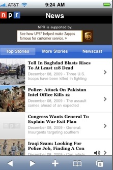 The redesigned NPR mobile site shows top stories and lets you browse by programs or stations. When you click on the “Listen now” button it starts streaming a podcast via the Quicktime player on the iPhone. You can also add a program to your playlist. And if you want to listen to live radio, you can also search for stations by call letter, city or zip code and then it starts streaming that station.