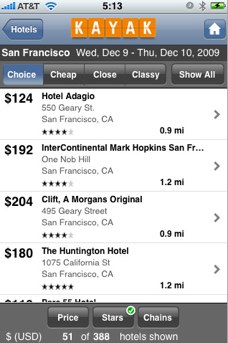 One feature missing from the app is the ability to conduct a transaction within Kayak; if you purchase a flight or hotel, you are led to the airline or hotel chain’s mobile page, which is often difficult to use on the phone. To remedy this problem, Kayak plans to add a booking assistant tool to its next generation of iPhone and mobile apps in 2010 that would allow users to buy the travel item without having to go the the airline, hotel or car rental site. Kayak will also be folding in advertising into apps but isn’t sure how ads will be integrated.