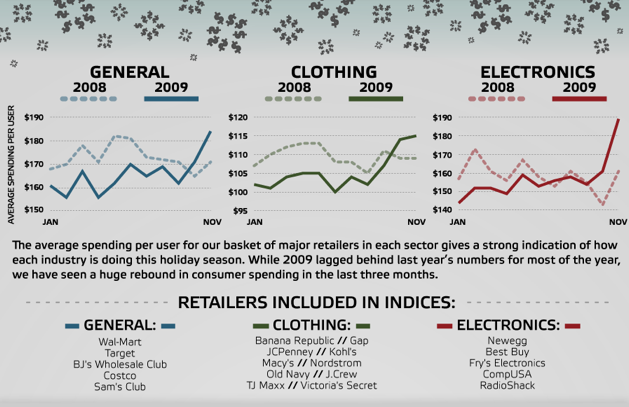 Feel like this holiday season is a bit cheerier than last year’s? You’re not alone. According to some new data from personal finance site Mint (which was acquired by Intuit for $170 million earlier this year), the holiday season has been accompanied by a major bounce in consumer spending. After a dismal shopping season in 2008, many retailers specializing in everything from electronics to high-end clothing have seen big jumps in the last few months. In a post called ‘The Return of Retail: Holiday Spending 2009’, Mint has illustrated these trends in a number of attractive infographics (we’ve included a few below).