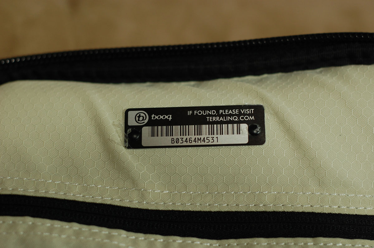 The Booq Terraling serial number is engraved on a metal plaque attached to the inside of the main flap. This plaque has a website URL on it that will help good sameritains return your bag. Of course a GPS sensor and a remotely-activated ink pack would be more effective, but you can’t really expect that for under a hundred bucks.