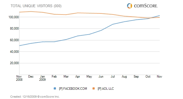 Just last week, Aol celebrated its re-emergence as an independently-traded company. But its one main advantage is that it still commands a large audience, and in fact was the fourth largest Website in the U.S.—until last month. ComScore data for November, 2009 shows that Facebook surpassed Aol with 102.9 million unique visitors in the U.S., versus 99.7 million for Aol.