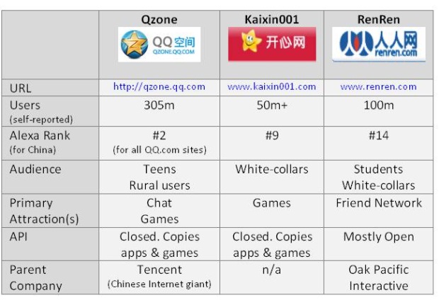 Although the SNS landscape is splintered, the government is determined to maintain control. There is no Facebook, no single dominant social network for all of China: the top 3 are Qzone, Kaixin001, and RenRen (see chart). When it comes to games, Qzone and Kaixin001 develop everything in-house with games inspired from Facebook, while Renren has a mostly open API so it can tap into outside developers to copy games for them. All have keyword lists and teams responsible for the instant removal of “objectionable” content.