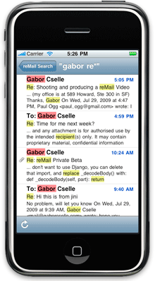 reMail launched its iPhone app back in August, offering a very powerful and speedy alternative to the native iPhone mail client, which has a number of shortcomings. For one, the iPhone’s default app stores only a limited number of messages on your phone — it needs to query the server for anything going back more than a few dozen messages, which means you’re out of luck if you’re on a plane and need to look something up. reMail manages to store your entire Email account on your phone using some advanced compression techniques (you can fit 100,000 messages into 500 megabytes) which gives you full text search at all times and is generally snappier than the normal search.