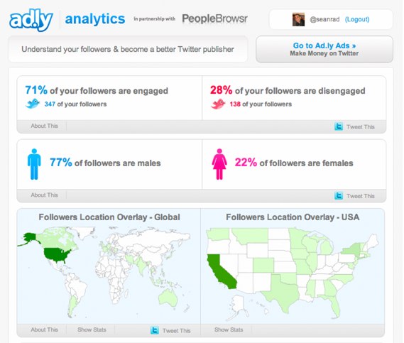 Today, Ad.ly has launched analytics for its platform, letting marketers and Twitterati measure the impact of their advertisements and Tweets. Some of the analytics that Ad.ly can now provide to advertisers include user engagement, male and female segmentation, location, and sentiment analysis. Ad.ly has partnered with PeopleBrowsr, a startup that data mines Twitter, to provide the data to users. Ad.ly’s founder Sean Rad says the reasoning behind the new feature “provide Twitter users the data they need to become more prolific content creators.”