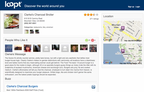 Now Loopt is venturing into Yelp’s territory (even as rumors swirl about Yelp) by making these local reviews available on the web. Similar to Yelp, each business has a separate page, where you can see hours, location (via a Google Map), ratings, pictures and more. Loopt will aggregate all the ratings and reviews made by mobile users on the business’ page, and web users can also comment on the page, but have to limit their comments to 140 characters or less. And Loopt aggregates reviews from professional sources like Zagat, and more user-review focused sites like Citysearch to further its recommendations on the page (this is also available on its mobile app). All of this data has allowed Loopt to create what founder Sam Altman refers to as a “local search engine.” Two examples of pages can be found here and here. As of now, the pages have limited functionality but Loopt will be adding user generated content and other data shortly.