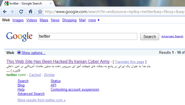 Update 8.: Google was showing the below briefly when doing a search for Twitter (thanks Chris). The translation from Farsi/Persian reads: