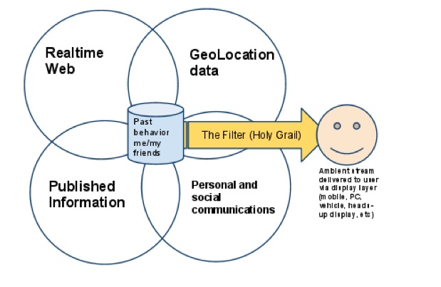 Before these building blocks can create an ambient stream which is not overwhelming, all of this data needs to pass through a filter. The Holy Grail is a filter which only serves up information which is relevant based on who you are, your social graph, what you or your friends are doing now, what you or friends have done before, and in context of other information you are consuming. It needs to be delivered wherever you are and on whatever device or display can deliver the ambient stream: mobile phone, laptop computer, TV, heads-up display in vehicle or inside your glasses. The future of how ambient streams might enter our world is illustrated with the following simplistic diagram: