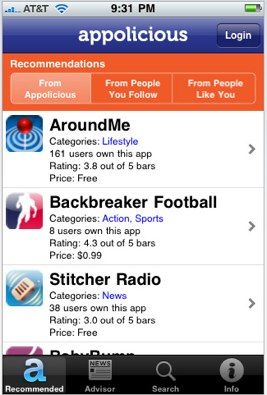 The Appolicious iPhone app will recommend apps for you based on ratings, reviews, comments and will also let users review and rate apps from the phone itself. Appolicious pulls in professional reviews about each app and also provides you with lists about the most popular apps on its network. You can also keep track of all of your apps and share your apps and recommendations with your social graph via Twitter and Facebook.The iPhone app is similar to fellow iPhone app Chorus.