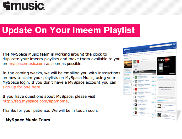 We’ve known this was happening for a while now (MySpace even tells users who visit imeem.com that their playlists are being migrated), but it now looks like the site is taking a more proactive approach to keeping its users informed. This is probably what it should have done from the start, instead of suddenly pulling the plug on its API and redirecting all imeem traffic to MySpace without any prior warning. But at least your imeem playlists will live on, which is better than nothing.