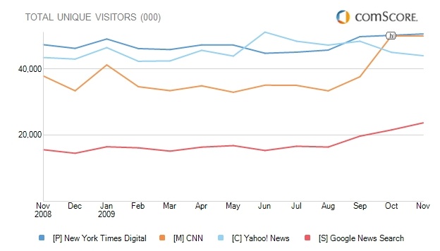 Still, the top two sources of news online are Yahoo News and Google News, followed by the New York Times sites and CNN (China’s QQ.com News would come in fifth with 53 million visitors a month, followed by the BBC and MSN News with about 48 million each—the Wall Street Journal Online is way down the list with only 6.8 million). Google News is the orange line in the chart above.