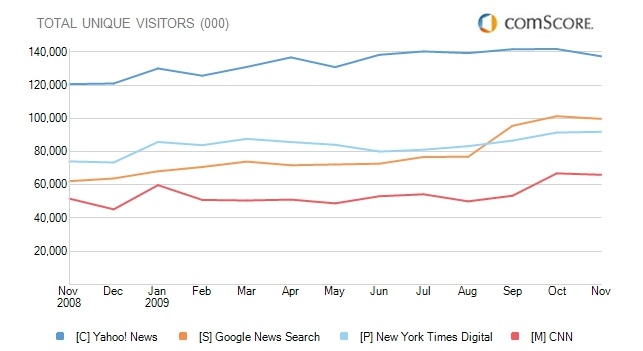 Well, Rupert Murdoch is going to love this. More people around the world get their news online from Google News than from CNN or the news properties of the New York Times. In November, 2009, according to comScore, Google News attracted 100 million unique visitors worldwide, making it a larger news site than CNN (66 million) or the combined properties of the New York Times (92 million). But do you know who is even larger? Yahoo News, with 138 million unique visitors worldwide. Funny how you never hear Murdoch complaining about Yahoo News.