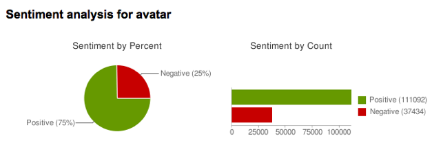 Twitter is the new word of mouth. Twitter Sentiment counts 111,092 positive recent Tweets with the word “avatar,” compared to 37,434 negative ones. That is a pretty large sample size, and seems to be a fairly good proxy for overall sentiment. Some of these could be Tweets about avatars in general, but if you look at the actual Tweets, they are nearly all about the movie right now. Some representative Tweets: