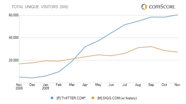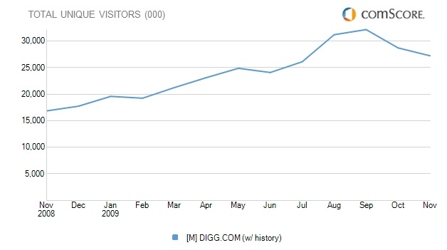 But its latest growth spurt stopped in September, 2009 when it peaked at 32 million unique visitors worldwide, according to comScore. In November, its worldwide visitors were down 15 percent to 27 million, which is about half the number of people who visit Twitter.com. Digg was passed by Twitter back in March (see chart below).