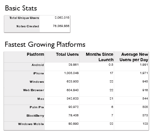 Evernote’s new users per day keeps growing every time it launches on a new platform or an upgrade (as it did over Christmas for its iPhone app, which now offers local storage). Those 2 million cumulative users are spread across iPhones (49 percent), Windows desktops (30 percent), Web browsers (29 percent), Mac clients (17 percent), Palm Pres (4.4 percent), Windows Mobile (3.9 percent), Blackberries (3.8 percent), and Android (1.4 percent). These device percentages add up to more than 100 because some people use Evernote on more than one device.
