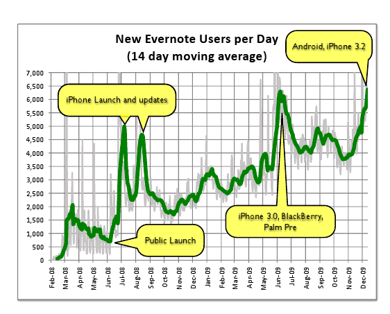 Looking at new users per day is more instructive. For instance, the Android app which just launched two weeks ago is signing up about 2,000 new users per day, about the same as the iPhone app. iPhone users represent 34 percent of daily active users, but Android already represents 3.4 percent—more than Windows Mobile, Blackberry or Palm Pre (which are all range from 1.2 percent to 1.8 percent). Libin thinks Android will contribute significant growth in 2010. At its current rate of signing up about 6,000 new users a day, Evernote should hit its next million-user milestone in 166 days.