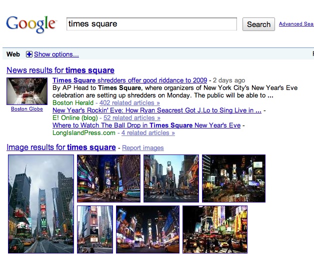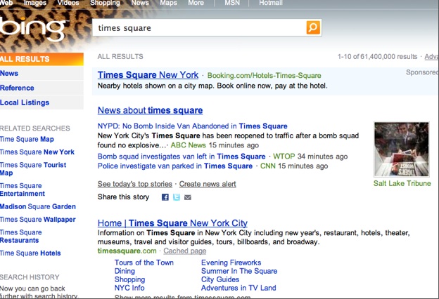 Times Square was evacuated earlier today when the bomb squad was called in to inspect a suspicious parked van. It turned out to be nothing, but as people were scrambling for information they would have been better off doing a search on Bing than on Google. A search for “Times Square” on Google about 15 minutes after I saw my first Tweet about it turned up two-day old news results up top about New Year’s Eve preperations and generic photos of Times Square, whereas a search on Bing at least had relevant headlines from ABC News (“NYPD: No Bomb Inside Van Abandoned in Times Square”) and CNN (“Police investigate van parked in Times Square”).