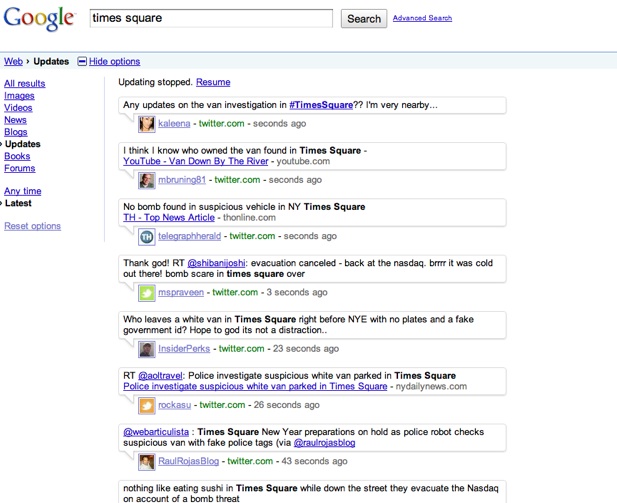 Of course, Google was perfectly capable of showing the best realtime results. The problem is that the best results were hidden on Google’s realtime updates page (click “Show options” and then “Updates” on any search), and Bing’s Twitter search page, which combines Tweets with headlines. I learned about the bomb scare and subsequent reopening of Times Square on Twitter before it even hit most news sites. But the next thing I did was search on Google. If you look now, Google is finally showing the right news results, but the screenshot above is what I saw when I searched, along with what I saw immediately after on Bing.