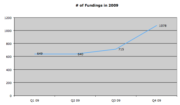 The total number of funding rounds increased 51 percent sequentially between the third and fourth quarters to 1,078. The number of fundings in the third quarter of 2009 was 715, and the year before it was only 618. So venture activity definitely picked up in both dollars and deals. Will these new levels set the tone for 2010?