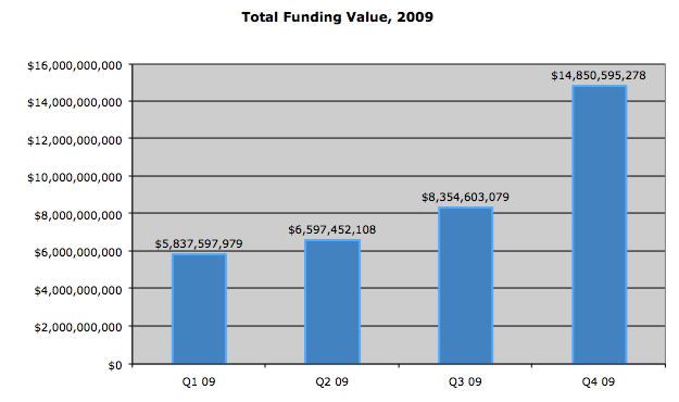 After a year when venture funding was in the doldrums, it roared back in the fourth quarter of 2009 to nearly $15 billion, according to a tally of the venture rounds in CrunchBase. The total value of disclosed fundings for the quarter was $14.85 billion, up 113 percent from a year ago (when the total was $6.96 billion), and up 78 percent from the third quarter of 2009 ($8.35 billion).