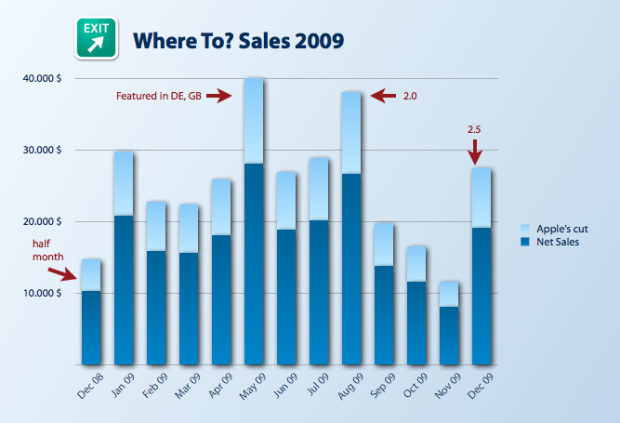 Since the acquisition – and beating FutureTap’s projections – the “Where to?” iPhone app made a total of $325.055 in gross sales. Apple took a $97.157 cut on sales revenue, so that means the young company made a $227.538 profit on the app in 2009.