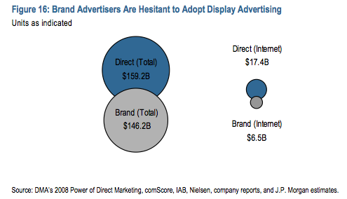In the advertising industry overall, revenues generated by direct and brand advertising are roughly split 50/50. But in the online world, where direct advertising is represented mostly by search and email ads and brand advertising by graphical display ads, the split is closer to 70/30 in favor of direct ads.