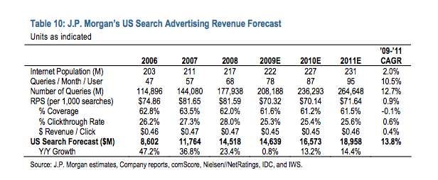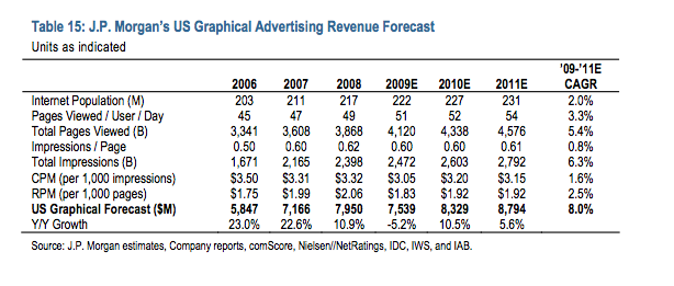 Khan expects U.S. search advertising to grow an even brisker 13.2 percent pace in 2010 to $16.6 billion, after virtually flat 0.8 percent growth in 2009. To get a sense of the disparity in the economics between display and search advertising look at JPMorgan’s estimates of display RPM (revenue per 1,000 impressions) and search RPS (revenue per 1,000 searches). The average display RPM is forecast to be $1.92 this year, while the average RPS is forecast to be $70.14. Which side of that equation would you rather be on? Which has the most upside?