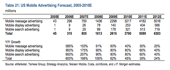 In mobile advertising, both display and search are puny compared to text messaging ads. Total U.S. mobile advertising for 2009 is estimated at $2.6 billion, up 62 percent. But $2.3 billion of that was from text messaging. Only 178 million was mobile search, and $140 million was display (both up 80 percent last year). In 2010, mobile advertising is forecast to grow 45 percent to $3.8 billion, with the breakdown being $3.2 billion SMS advertising, $253 million mobile display, and $321 million mobile search.