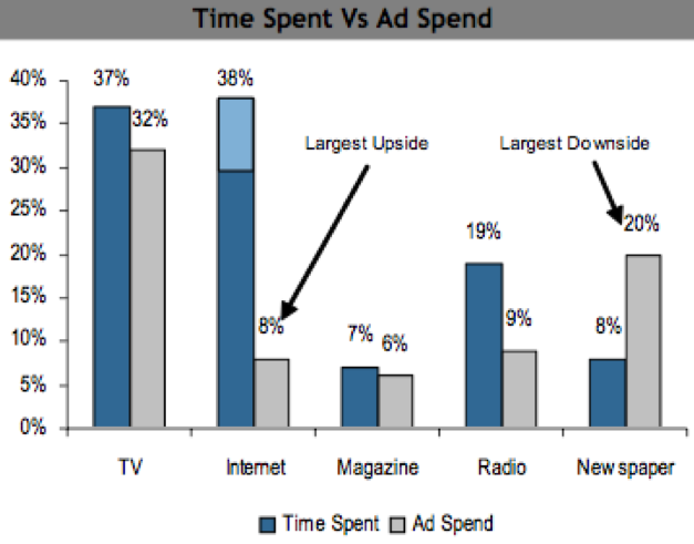 One of the biggest reasons to be hopeful about the outlook for the continued growth of the Internet advertising industry is that when you look at the time U.S. consumers spend on the Internet versus the amount of ad dollars which go there, the proportions are out of whack. As recently as 2008, U.S. consumers spent 38 percent of their media consumption time on the Internet (29 percent if you exclude teens and young adults), but it attracted only 8 percent of advertising dollars. Whereas consumers spent 37 percent of their media consumption time on TV, which captured 32 percent of advertising dollars. If you believe that time is money, advertising dollars should continue to flow towards the Internet.