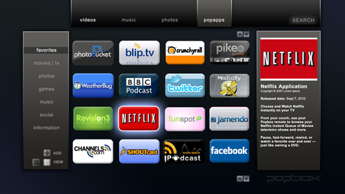 The new interface supports Java, Flash, and Quicktime games and so-called Popapps that can do everything from displaying Twitter feeds to local weather when a user pauses a video. This greater support allows the box to hook-up and stream content from various Internet sites and fully utilize API’s like Netflix. Of course the box retains the vast video codex and container support that made the Popcorn Hour legendary.