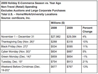 The New Year brings with it the much awaited numbers from online holiday spending. And its good news. For the full holiday online shopping season, $29.1 billion was spent online, showing 4 percent increase versus the same period last year, according to comScore. It looks like consumers spent just over $2 billion online over the past week, as $27 billion was spent online as of last week for the shopping season from November 1 through Christmas Eve. The day consumers spent the most online happened to be on Tuesday, December 15, a.k.a, “Green Tuesday,” with consumers spending a total of $913 million in one day. In fact, Green Tuesday was one of nine individual days to surpass $800 million in spending during the 2009 holiday season. Not too shabby, considering the economy has yet to fully recover from a crippling recession.