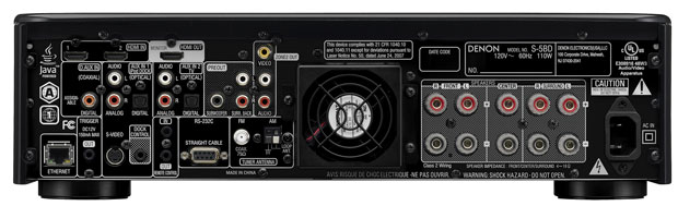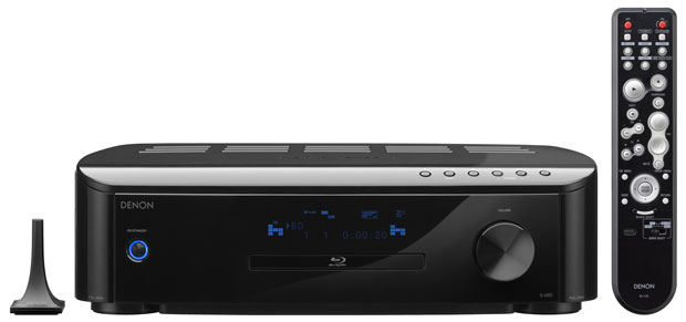 The receiver half is a 2-zone, 2-source 5.1-channel system with 3 HDMI 1.4 (seriously, 1.4) inputs and one output, along with iPod connectivity via a USB port. It of course has advanced audio processing from Dolby and Denon, and is actually one of the first products to support HDMI 1.4’s Audio Return Channel.